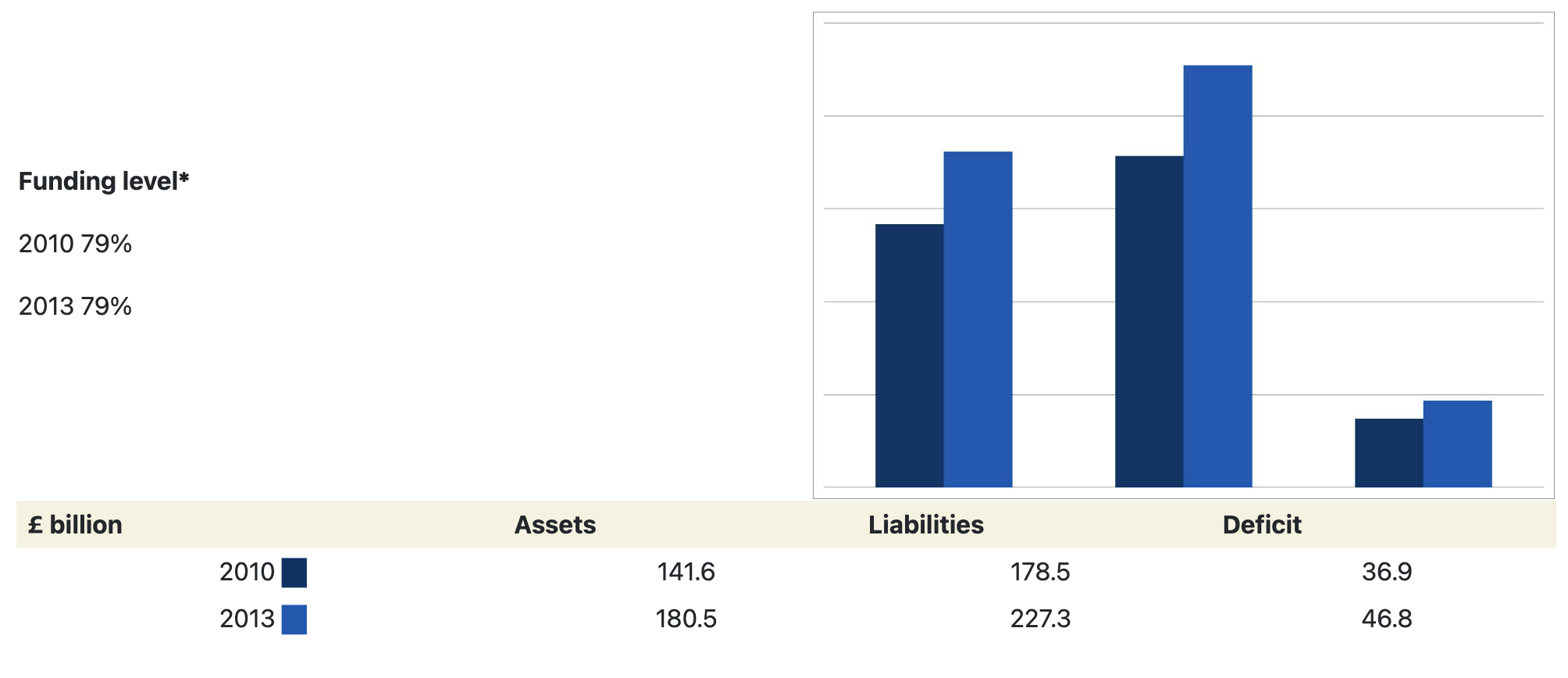 As at 31 March 2013, the total asset value of the Scheme was 181 billion, compared with 142 billion as at 31 March 2010. The liabilities totalled 227 billion in aggregate. The overall funding level has remained at around 80%.