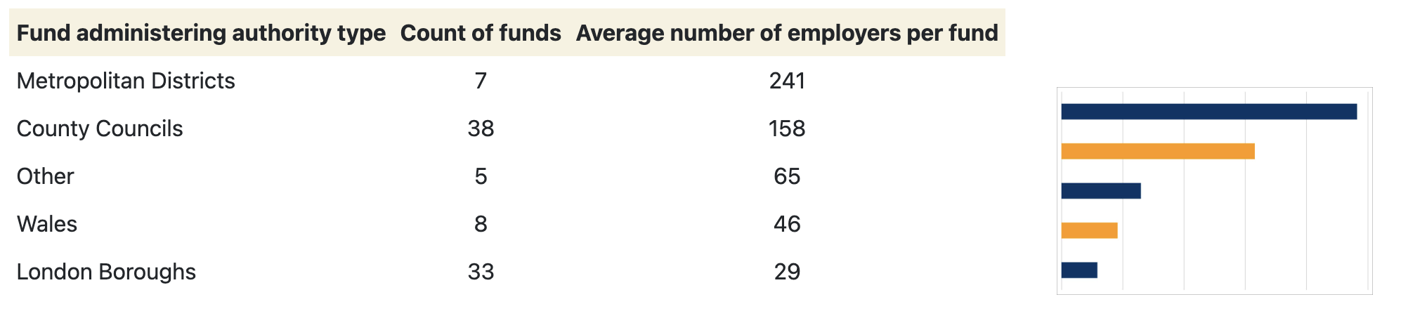 The chart shows how the average number of employers differs between the types of administering authority. County council administered funds typically have more participating employers compared with London boroughs. The ‘Other’ category comprises the London Pension Fund Authority, Transport Authorities and the Environment Agency funds.