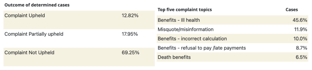 Most complaints were about ill health and other retirement benefits. The PO upheld <13% of complaints with the vast majority around 70% being either not upheld, or were rejected, referred elsewhere, or resolved without the need for a PO determination. This represents a significant shift from pervious years to closing investigations informally, without progressing cases to formal determination. Overall the LGPS has had relatively few upheld complaints.