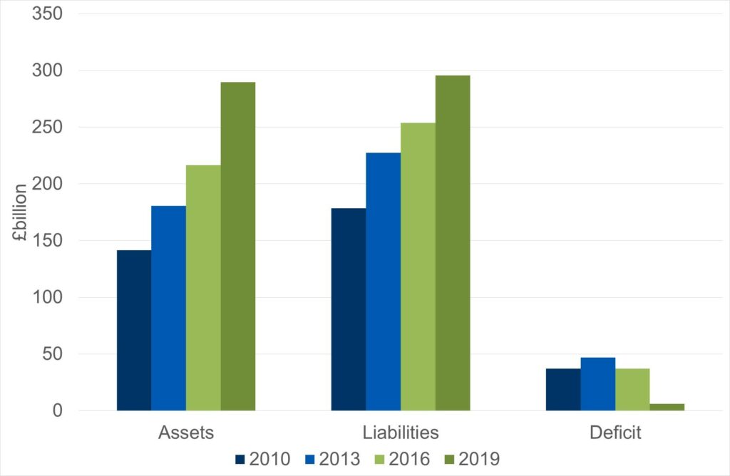 As at 31st March 2019, the total asset value of the Scheme was £290 billion, compared with £216 billion as at 31st March 2016. The liabilities totalled £296 billion in aggregate. The overall funding level was around 98%.