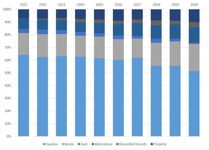 Equities are no longer well ahead of other asset classes in terms of the long term returns that have been delivered but they make up a much smaller proportion of the average fund now than they did 30 years ago.