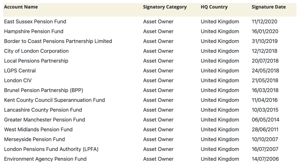 Some 32 LGPS funds/pools (36%) were Tier 1 signatories to the Code and 12 funds (13%) (inc five pool companies) were signatories to the UNPRI (see table below). Since March 2020, East Sussex Pension Fund became a signatory to UNPRI.