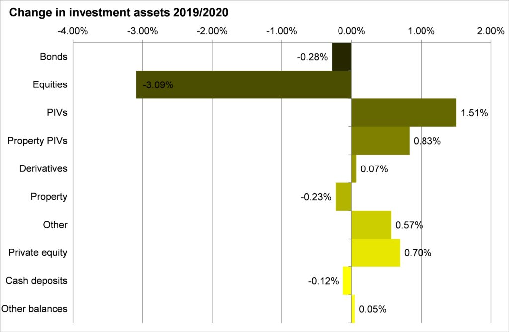 Those funds that had more of their money invested in alternative strategies, particularly private equity, performed better than their peers who had high quoted equity exposures. Some funds had put in place insurance against market falls and those funds reaped the benefit last year. However not all strategies that were intended to be low risk delivered – alternative bond strategies failed to deliver positive results as did Diversified Growth investments.
