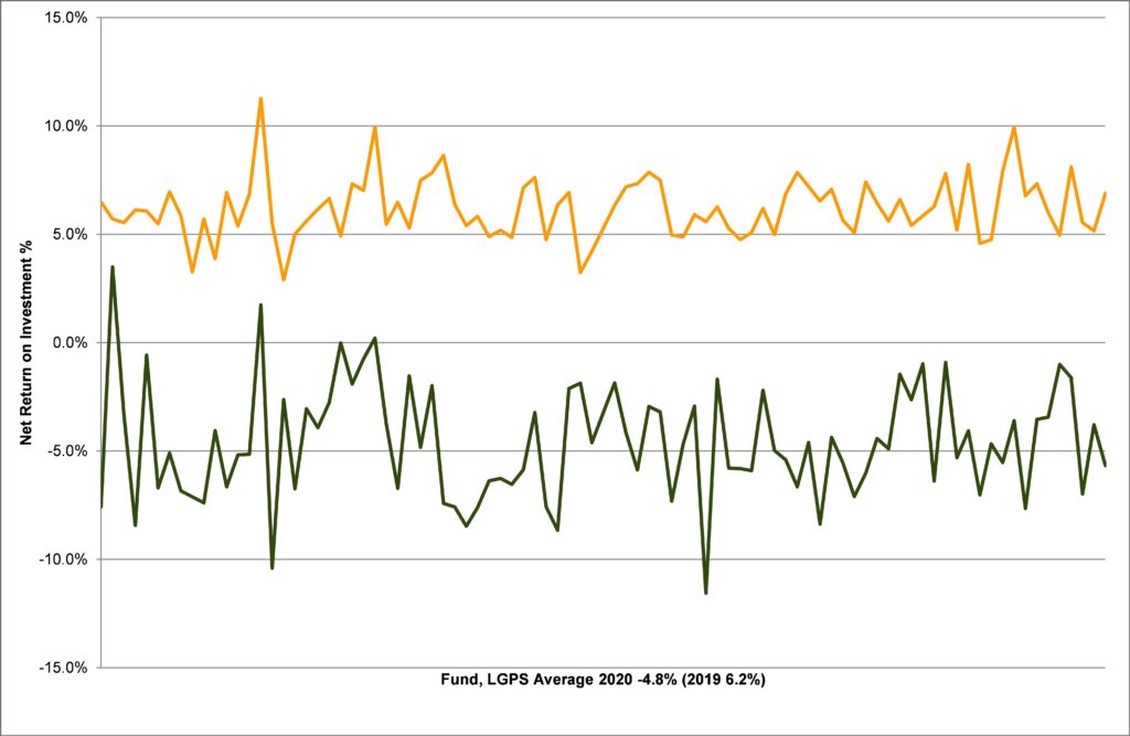 Net return on investment % is calculated by dividing the net return on investment by the average value of the fund over the year – this differs from calculated performance.