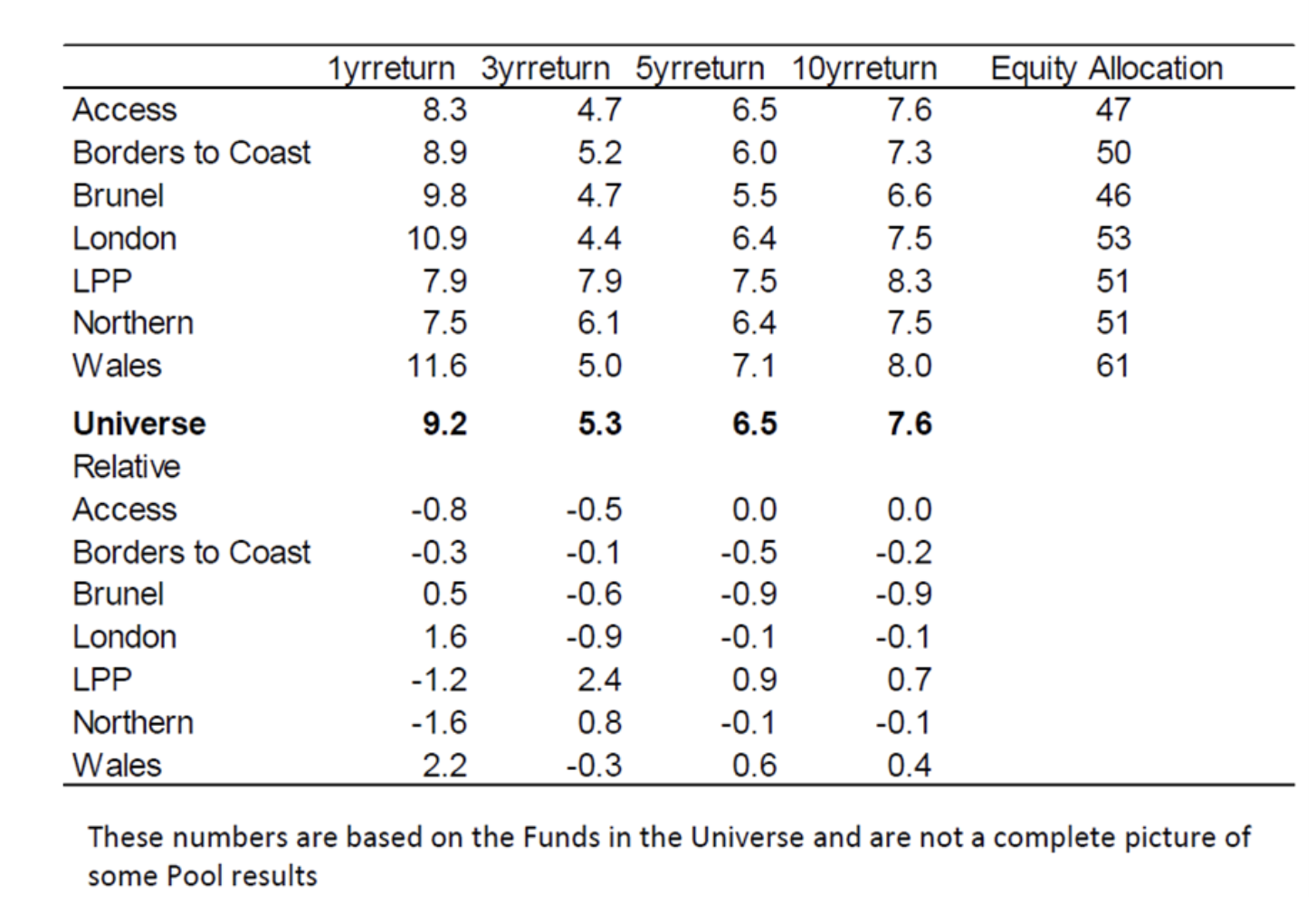 The following table (produced by PIRC) summarises the performance of assets held in the different pools, although these differences are largely attributable to available asset allocation.