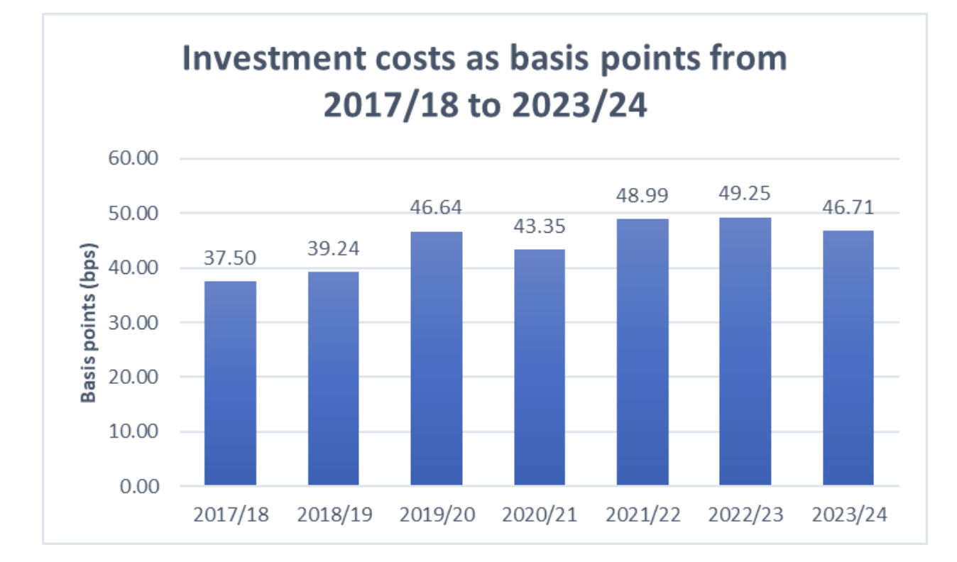 SF3 data shows that investment costs have also risen over time. In 2017-18, investment costs were in the order of c£1 billion. The latest SF3 data return shows cost have risen to c£1.8 billion but it is important to also look at them as a percentage of asset values, as illustrated in the chart below.