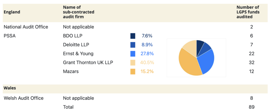 Each LGPS funds’ financial accounts are audited separately from each Local Authority financial accounts. They are then consolidated into Local Authority financial accounts and ultimately into the financial accounts of DCLG and HMT.