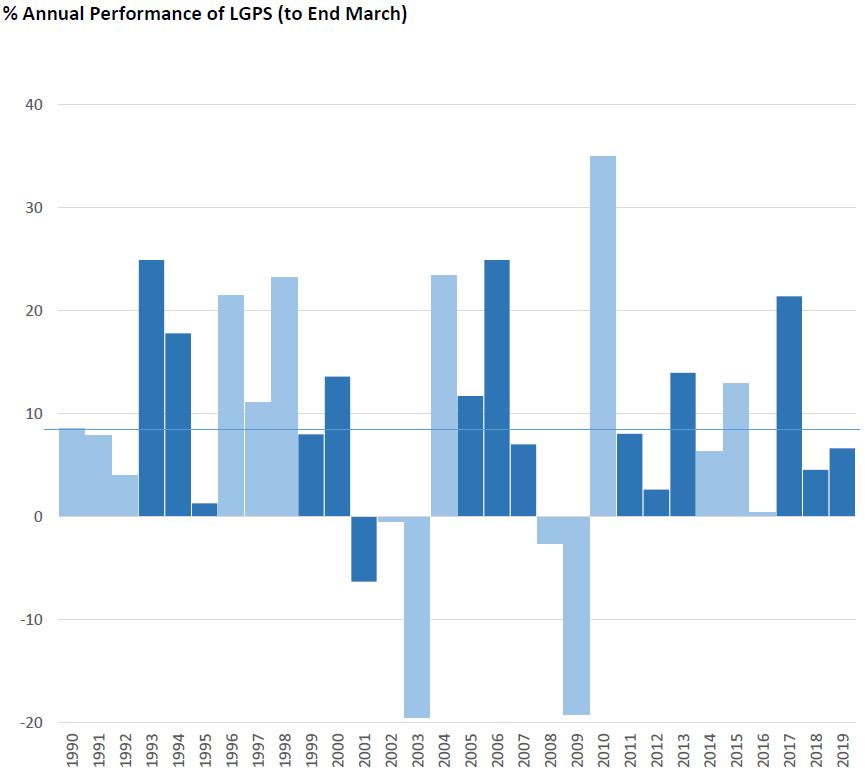 There were many headwinds facing investors over the last year. Unease over historically high levels of markets, political uncertainty, the escalating trade war between the US and China and the ongoing unresolved issues around how, or even if, the UK would leave Europe all impacted sentiment and made for a volatile year. Despite this, over the fiscal year the average Local Authority pension fund returned a very respectable 6.6%. While this return is below the 30 year average (blue line in the chart below) of 8.4% p.a. it is well ahead of inflation and of actuarial assumptions which are currently around 4% p.a.