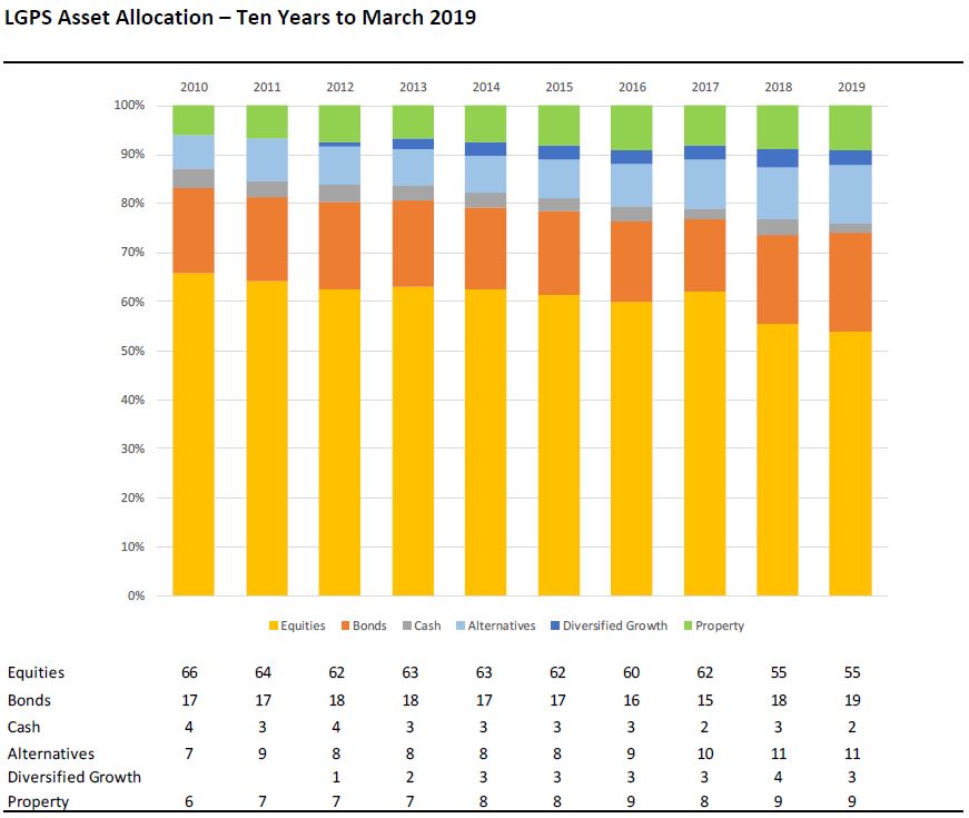 The latest year did not see a continuation of the dramatic reduction in equity exposure that had been in evidence in 2017/18 and high level asset allocation remained unchanged over the year as can be seen below.