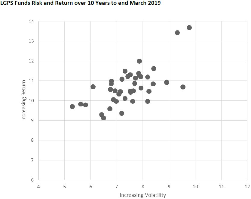 Over the last ten years the average fund returned 10.8% p.a.. As can be seen below there was a large difference between the return generated by the funds that accepted the highest level of volatility and the funds that had structures their assets to reduce this aspect of risk. The most volatile fund achieved a return 41% better over the period than the least volatile.