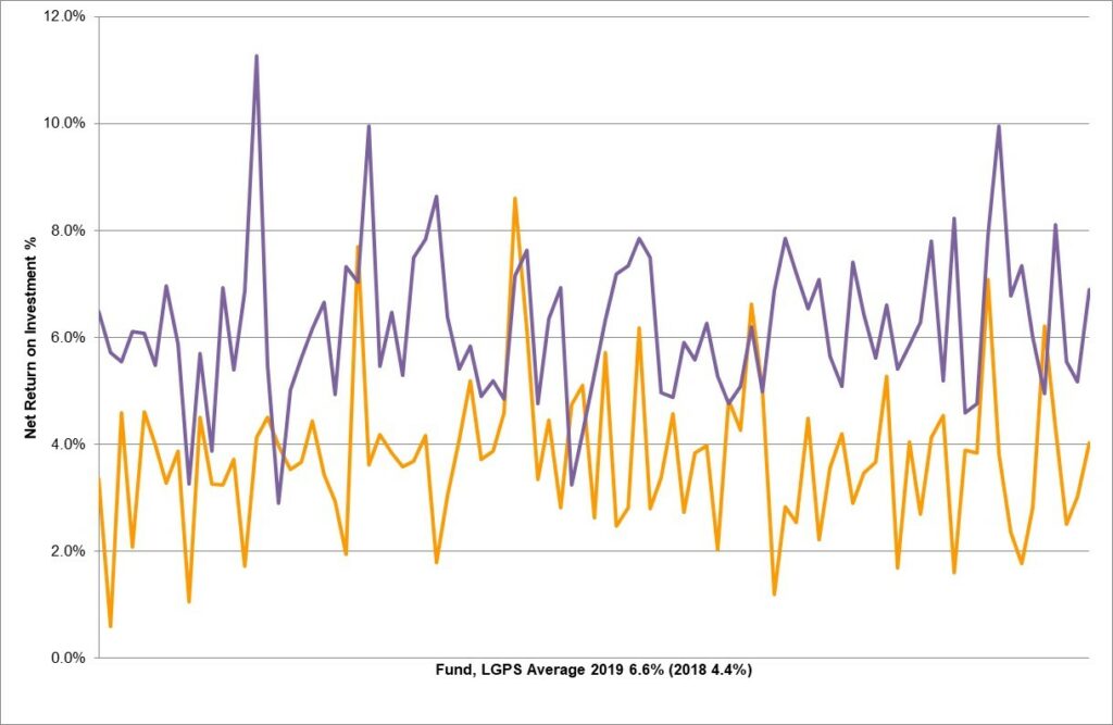 The above chart shows the distribution around 6.0%, for 2019 █, with most funds falling in a range of between 4.0% and 8.0%. For 2018 █ the distribution was around 4.0%, with most funds falling in a range of between 2.0% and 6.0%.